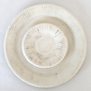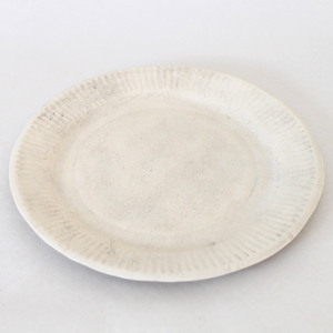 まず板状の土を用意して、そこに実際の紙皿で型押ししてこの模様を出しているんです。もちろん、その板状の土はまだ焼く前なので少し湿っています。そのため、紙皿も水分を少し吸ってへたり、結果としてそこに型押しされる模様もちょっとへたった紙皿っぽくなります。