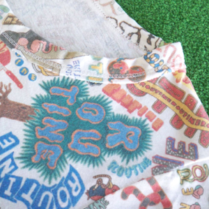 写真の通り、大きめの襟ぐりとスマートな形がワンサイズ。どちらかというと女性に適したサイズで、細めで小柄な男性であれば着こなせる人もいそうです。細くても背の高い人はヘソ出しTシャツになってしまう場合があるのでご注意を。パンクにもキュートにも振れる実力派?!ちなみに、柄の切り取られ方は1枚ずつ異なります。