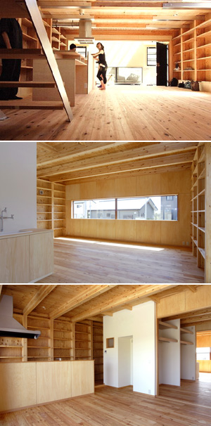 外壁は、上から2番目の写真の黒いエアロハウスと同じく、木の板を縦張りに。室内の床も、パインのフローリングです。