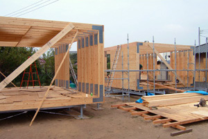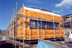 外壁は、左上の工事中の写真のような、断熱材を張るところまでの状態なので、お好きな仕上げ材料で外壁を作ってください。窓の位置や大きさも、お好きなように。(開口を設置可能な範囲は、図面でご確認ください。)