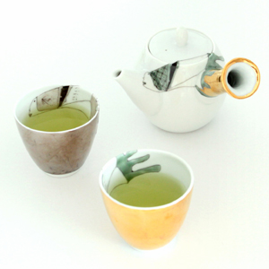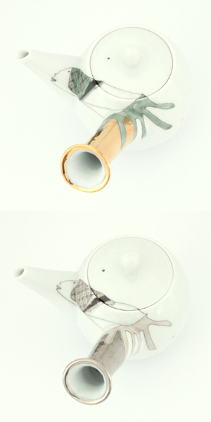 水の中をゆらゆらと泳ぐ流動感は、湯呑みとはまた違った趣がありました。ふたと本体にまたがって泳ぐサカナマン、持ち手から注ぎ口にかけゆるやかに泳ぐサカナマン。2匹のサカナマンはまるで急須に張り付いてしまった化石のよう。