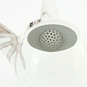 ふっくらとした丸みは、高さ方向にシュッとした品の感じられるすてきなフォルム。ふたの薄さや、コロンとした取っ手も、いかにもかん子さんの手仕事。内側の茶漉しにあたる部分も繊細な仕事のあとが感じられ、妙にキュンときます。なんだかイチゴみたい。