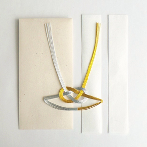 水引の選び方などは、地方や時代も関係して、お祝いの内容ごとにルールはいろいろあるみたいで。そのあたりは、場面に応じて調べる必要がありそうです。このご祝儀袋には、あわじ結びの水引2種(紅白・金銀)・中包み・短冊2枚がセットになっています。