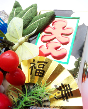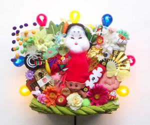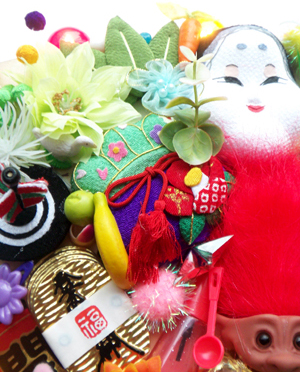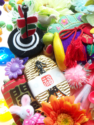 そういえば、お多福もいる、大入り袋も、松飾りも、金の俵も、矢の付いた的も、しめ縄飾りまで!