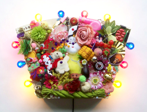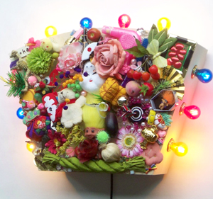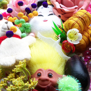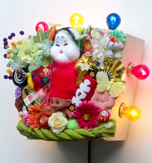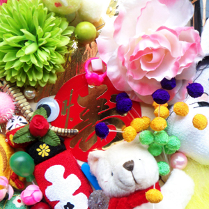 お面や、鯛の人形、キラキラ輝く飾りがてんこ盛り。