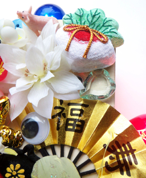 目の当たりにしたこの熊手は、いつものKimさんテイストに和風も加わり、にぎやかに、楽しげに、キラキラとまばゆくて、そして微笑ましいほどかわいらしくて。