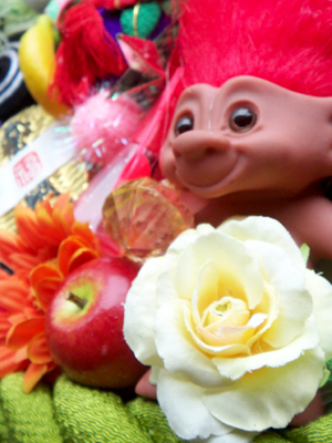 おなじみのトロールや、恐竜もいるし、本当にどこで手に入れるのか、小さなおもちゃや飾りなどが、きらめくように散りばめられています。