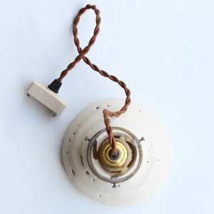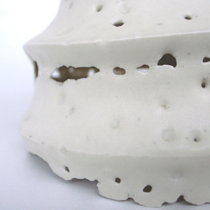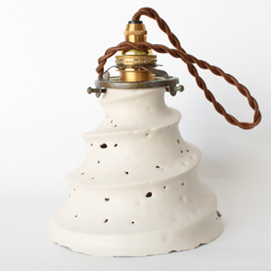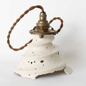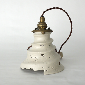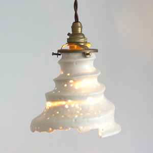 考えてみればすぐ納得がいくのですが、虫食い皿の面白さって「お皿の穴と光の関係」なんですね。で、単純にそこだけを考えていくとランプのシェードが思いつく。光と関係のある磁器製のものだから。