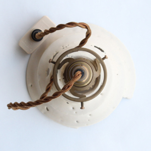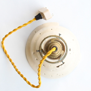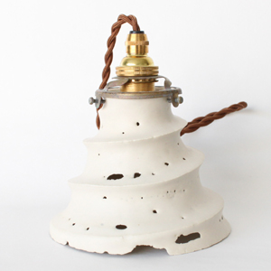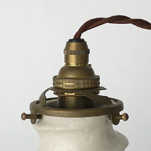 さらに石木さんがこのランプシェードに合いそうなソケットとシェードを接続する器具を買ってきました。古道具っぽく見えるようにちょっと買ってきてから寝かせてあります。そこにソケット付コードを付けるのですがそのコードの色も茶色バージョンと黄色バージョン。どちらもいい感じにフィットしていると思います。いや、なんていうかいい感じに古い感があるんですよね。このランプは新品の時から。