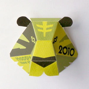 それをキュキュっと折って、ちょちょっと糊付け、そして組み合わせると、ほら。トラの顔が出来上がりです。簡単!