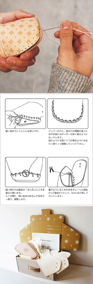 革にはちゃんと針を通す穴も空いていて、キットに針と糸も入っているので、誰でも簡単に作ることができます。