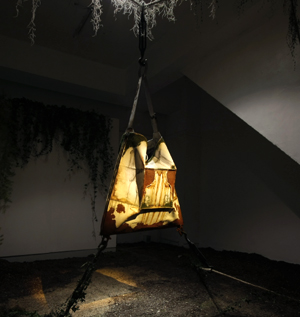 見慣れた白いギャラリーの姿はそこになく、床は土で覆われ、壁や天井からはツタ状の植物が伸びる薄暗い空間。そして、腐食した工場の壁のようなカガリくんのカバンが、光を浴びてそこに吊るされていたのです。