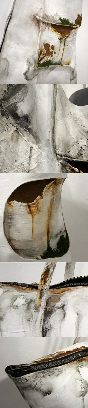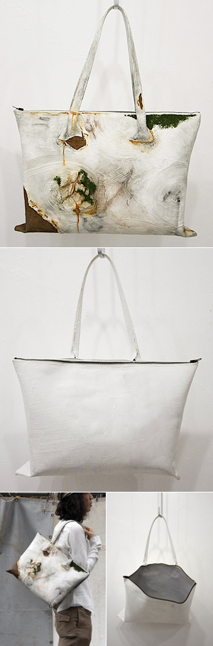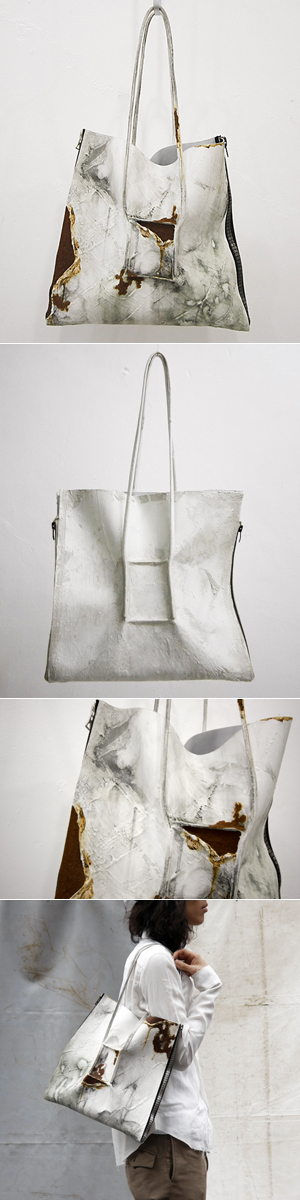 革の上に、本来建材であるパテを塗りたくり、作られたカバンはまるで外壁さながら。いや、作られた瞬間の壁に外壁も内壁も無いのだろうけど、カガリくんの作る壁は、どことなく外壁で、そしてグングンと外壁化していきます。