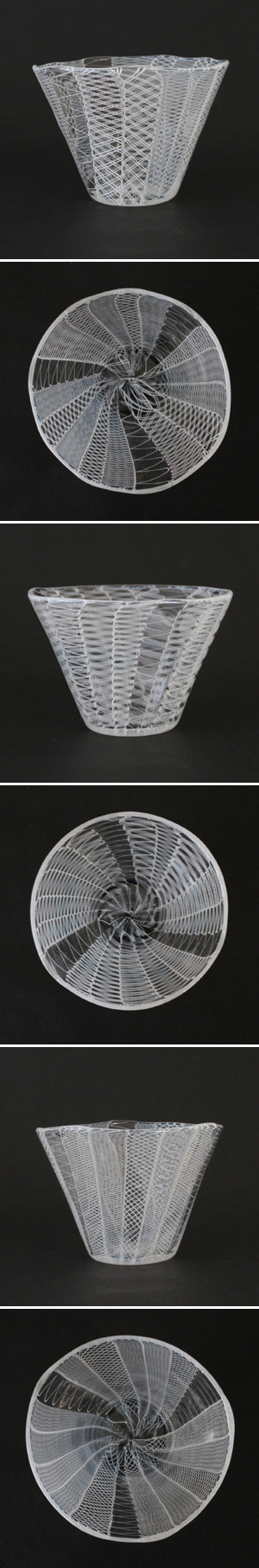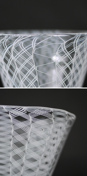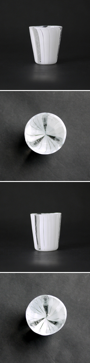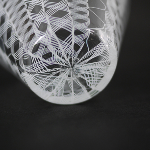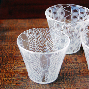 この工法で作っていくと、模様に立体感ができることになります。絵付けだと表面に描いていくので二次元の絵になってしまうのですが、ガラスが無色透明でさらに厚みがあってその中に規則的に、だけどガラス特有の火との格闘の結果、すごく不規則な模様が出来上がります。これは本当に眺めているだけで全然飽きない。制御と非制御の狭間にある不思議な模様がそこに現れます。ガラスって本当に瞬間芸なので、ちょっとした気泡や黒点みたいなものが入ったりもしているのですが、それも含めてダイナミックさを楽しんてもらえれば。