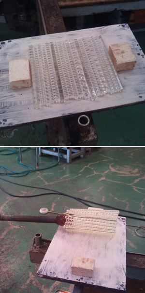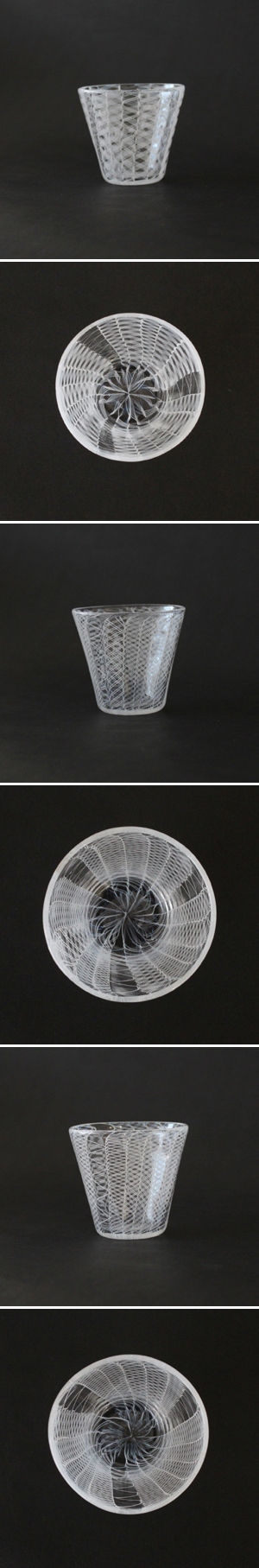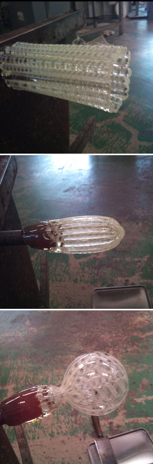 そのガラスの棒を何本も横に並べて、吹き竿の中心にあるガラスで巻き取って。その状態で成形していく、という工法です。最初につくる細いガラス棒に白色のガラスをつける本数を調整して色々なものを作り(例えば白色1本ねじりとか10本ねじりとか)それをいろいろな順番で並べていくと、写真のような複雑な模様のガラスができあがります。