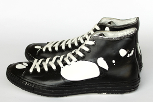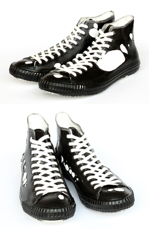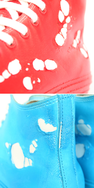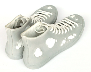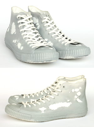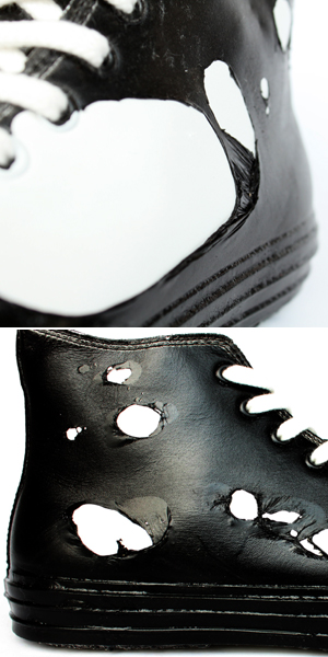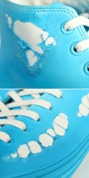 その表面は、皮膜が所々で破れ、ベースのスニーカーが白い革をその穴から覗かせています。