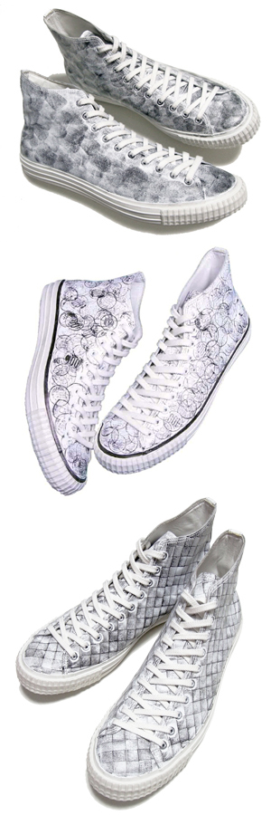 上から、指紋をスタンプしたスニーカー、コインをスタンプしたスニーカー、スタンプで編み目を表現したスニーカー