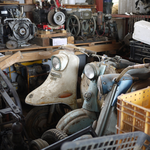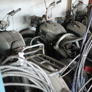 そのアトリエの様子が。。。いわゆるガレージタイプの建物なのですが、使い方もガレージで。というか、秘密基地で。多分40坪ぐらいの面積だと思うのですが、そのうち山葡萄籠のアトリエとして使われているのは7,8坪。ほとんどは字義通りのガレージ。すごくきれいに使っているオープンのロードスターと、バイクが無造作に40数台。あと、発動機(エンジン)がこちらは70台前後。なんか無造作に並んでいるんです。しかも、その無造作に並んでいるバイクや発動機がすごい年代物で。なんですか?これ。と聞いたところ。だいたいが昭和20年代、30年代のもので例えばバイクに関してはカワサキの基礎の一部となった目黒製作所のバイクで単気筒のものはだいたい揃っているかな、と。