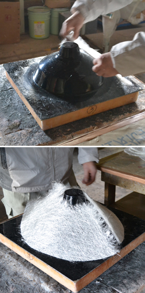 FRPの成型は型にガラス繊維の混じったシートを接着して行っていきます。これが三次元型になっていくと、当たり前に複雑になっていって。素人作業じゃおぼつかなくなってきて。そんな時に西原さんはどうするかというと。地元のFRP工場に出入りし始めます。それで、またおっちゃんに気に入られて。半透明の雰囲気の調整とか。型のアドバイスとかもらいながら仕上げていきました。