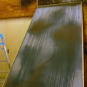 脚立の上から、酸化を促す液体がふんわり吹付けられ