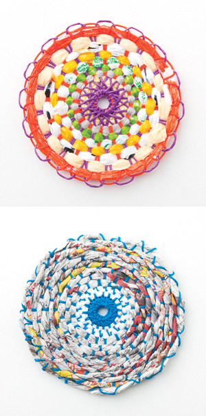毛糸や、綿糸、紐、というのは分かりやすいところで、それ以外にも、ビニールや、布、新聞紙なんていうのも。