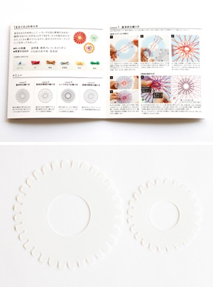 この「MARUIRO」は見ての通り、小さな丸いプラスチック。歯車みたいな形の道具で、これだけで、この可愛い「まるイロ」が作れてしまう、ということなのです。
