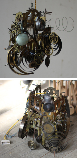 おなじみ壁時計で使用されている中身、時計機械部品を使用した照明です。時計の時もそうでしたが、中身が美しいのでそれをそのまま照明にリメイクしてあります。