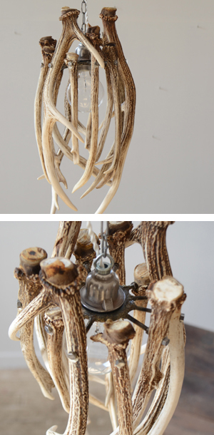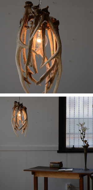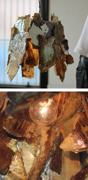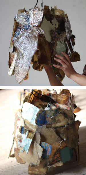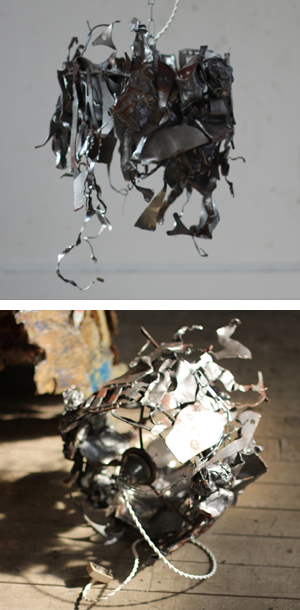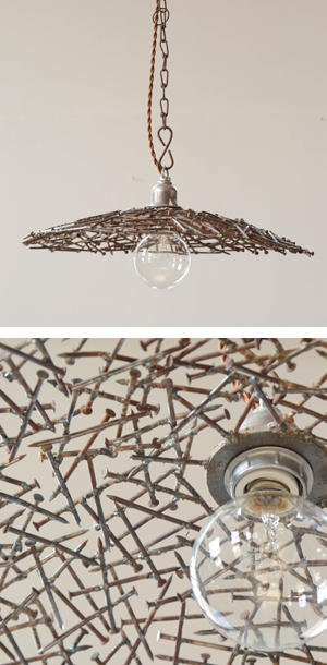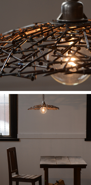 文字通り片づけの際にあった釘を何百本も溶接してつなげたランプフード。光の洩れ方が面白いです。