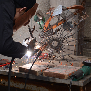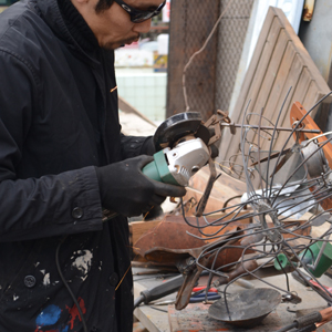 ちなみに、この照明。古道具漁ってきてくっつけただけではなくて。意外と手間かかっています。そもそもこのそれぞれの鉄のさび自体は自然の経年劣化によって起こっているのですが、そのさびを落としてあげないと、溶接でくっついてくれないんですね。なので、これ何をやっているかというと、まずシェードの枠組みを作ってあげて、そこにくっつける鉄を見つくろったら、そのくっつける部分を研磨して溶接する。その後、ある程度完成してきて吊ってみると、片方重くてシェードが傾く、みたいなことが多発するので、反対側に違う鉄を溶接したりして微調整していく。そりゃどんどん重くなる。