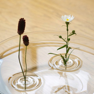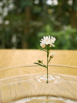 何が一番違うのかと言えば、やっぱり平らな水に花が立ち上がるところです。花器と花という関係ではなくて、透明な面の上に花が立つので、その周りに小さな風景のようなものを感じて、奥行きのある世界が楽しめます。