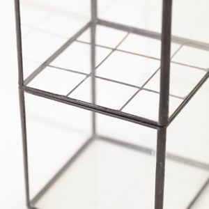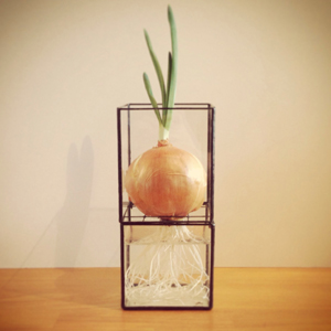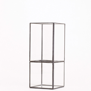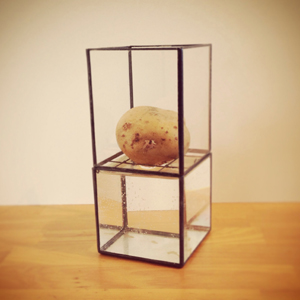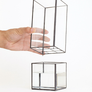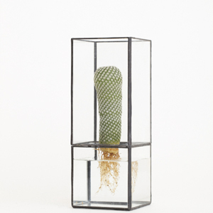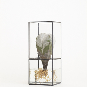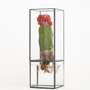 まず基本は容器の単体売り。ステンドガラスの技法を使った縦横8センチ角の直方体で高さでバリエーションがあります。上下は分割式になっていて下に水を上に植物を置いて育ててください。根は水につかるギリギリのラインではさみで切っておくと真っ白の根が生えてくるので観賞用にはその方がきれいだと思います。ちなみに植物自体を大きくしたい場合は、液体肥料を希釈して下の水に入れておくと育ったりするそうです。この辺は同包する取扱説明書をご覧ください。