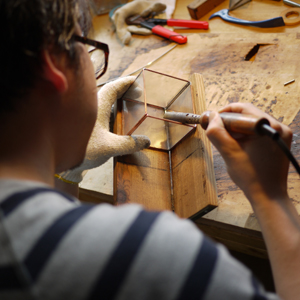元々は妻沼さんがゲーム会社のプランナー、山田さんはデザイナー。大学が美術系で同期だったので、その頃から一緒になんかやろうと話していて。ここからがまた変な話なのですが、この器の案を思いついたのは去年の春頃で、その頃妻沼さんが会社を辞めようかと思っていたらしく。でも、彼らは別に作り手ではなかったのでこんな器を作れるかと、ステンドグラス工房に当たっていったみたいなんですね。そうしたらあるステンドグラスの作家さんが作り方教えてあげるから自分で作れば?って。それで妻沼さん脱サラして、唐突にステンドグラス作家さんに弟子入りみたいになって、去年から自分で容器作りを始めていまして。。