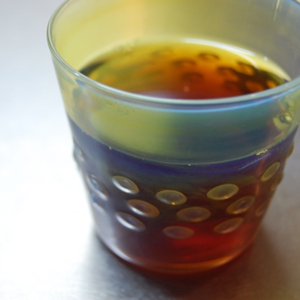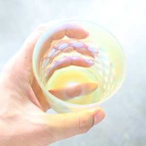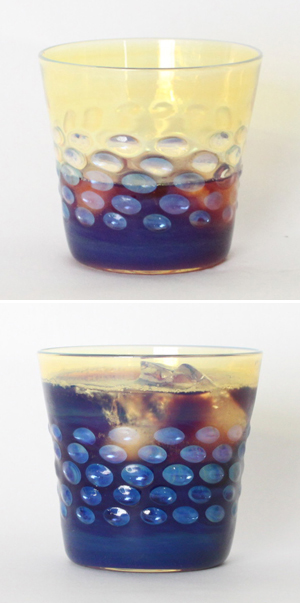 大別するとバーナーワークとブローワークなのですが、その中でもいろいろな技術があります。例えば今回ご紹介している「月色」というシリーズはヒューミングという技術で銀を気化したものを吹き付けて作られています。細かい金属の粒子であることもあって、背景の色や光の加減で青から黄までの色に条件によって変化します。