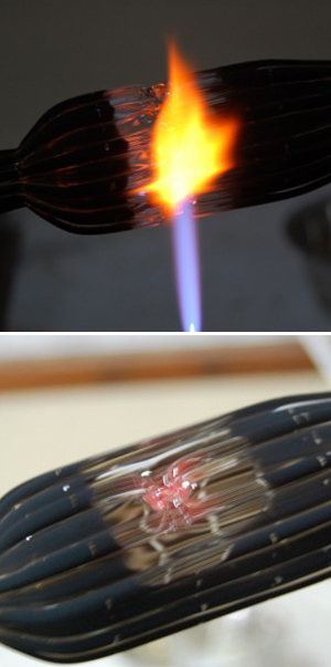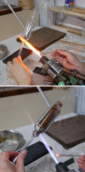 まずは「月色のグラス」の作り方。銀を気化させてガラス管に付着させていきます。