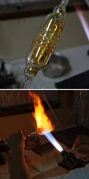 できたダイアのガラス管を吹いて膨らませて欲しい大きさにします