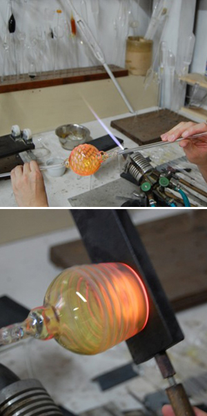 普通はブローワークだけで器を作れるし、逆にバーナーワークを使って器を作るのはアクセサリーを作るよりも難しいので(モノにもよりますが)器とかそういうものを作ろうとする場合はバーナーを習得する必要はないんです。またそれを作るために使う道具が全然違うのも結果的に両者の技術を完全に分けている原因だったりします。