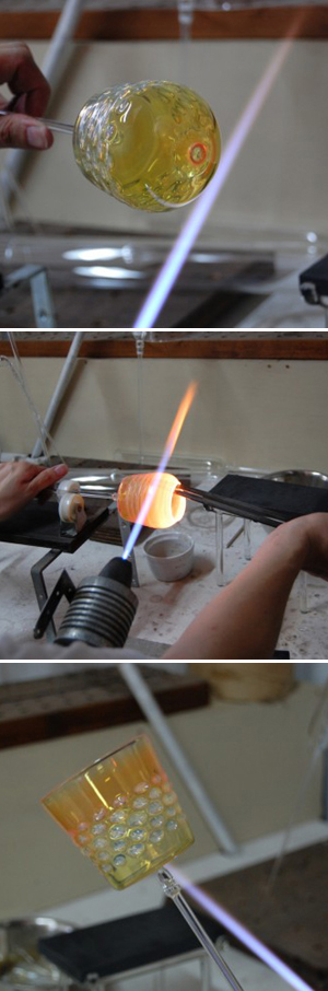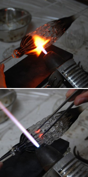 ざっくり書くとブローワークというのは吹いてガラスを成型する手法で、バーナーワークはバーナーを使って成型する手法です。ブローワークは主に器を作るのに使われて、バーナーワークは細かい細工ができるのでトンボ玉とかアクセサリーとか小さなガラスを作るのに使われます。で、えむに水上さんの特徴は上記のバーナーワークとブローワークを両方並行して使えて器を作れることだったりします。分かりづらいですよね。。
