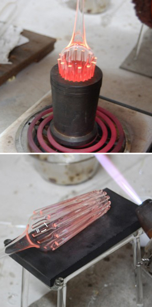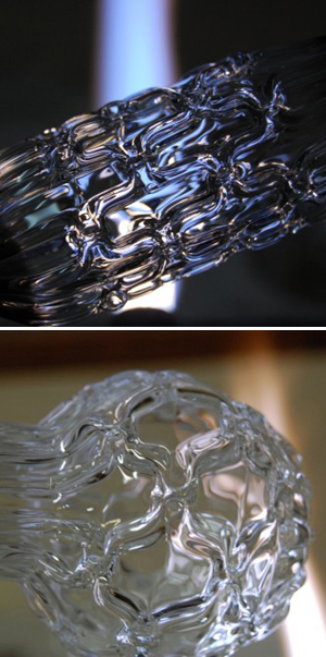 また「Flow」と「ダイア」のシリーズはベネチアングラスの技法とブローガラスを利用して作られています。吹いた耐熱ガラスに別で熱したガラス棒をくっつけて、ねじったりくっつけたり。ちなみにバーナーワークを使う場合は部分的な冷却と過熱を繰り返すので結果的に耐熱ガラスを使用していたりします。