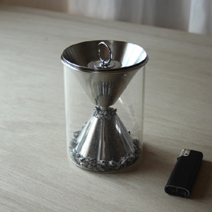 まずは灰皿。タバコの灰と吸殻がうまい事分かれて収納されます。元々は料理とかに使われる小さいボールみたいな(なんていうんだろう?)をお互い底面合わせて上下にしてみたら砂時計みたいだな。そんな感じで何か作れないかな?みたいな発想でガラス買ってきて、筒で繋げてみて、モノづくりが成されています。ちなみに元々は、というか今でもphyleの2人はデザイン畑の人でもあるので手づくりだからこんな感じでいいでしょ。みたいな甘さはモノのデザインとしては存在していなくて。例えばこの上のステンレスボールとガラスの接合部とかはガラスの中にボールが落ちないように輪っかが改めて溶接されているんですけど、その溶接とかが自分たちでやると汚くなっちゃうからって、偏屈な技術力めちゃ高いおじさんにお願いしてこの部分だけやってもらったりしています。
