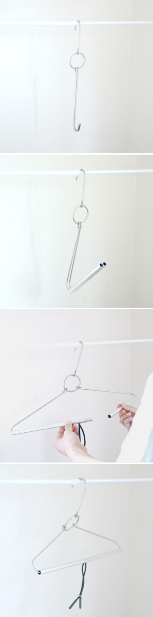 次はハンガー。ちょっと不完全なところがありまして、、これは折り畳みのできるハンガーです。メインの骨組みは北京ダッグとか吊るすものです。これも広げたりしていたら、なんかハンガーぽいよね。みたいなところから折り畳みハンガーとしてのデザインがスタートしています。ただ、これ実際に使ってみると微妙な部分があって、、1つはハンガーとしてなんかちょっと傾いているんですね。真下にストンとハンガーが来ない。ただ、これは立体的なよくあるハンガーだと思えば使う上で不便はない。一応。