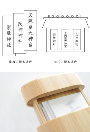 ・神様は序列を大事にするので、お札の重ね方にも順序があります。手前から神宮大麻、氏神神社のお札、崇敬神社のお札となります。