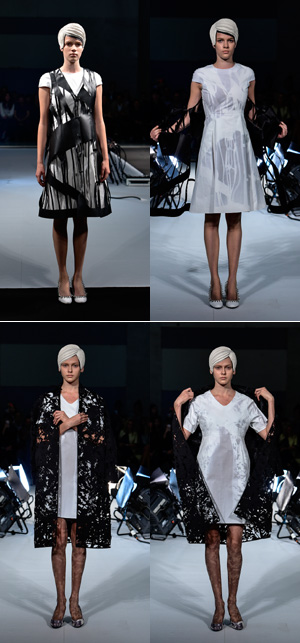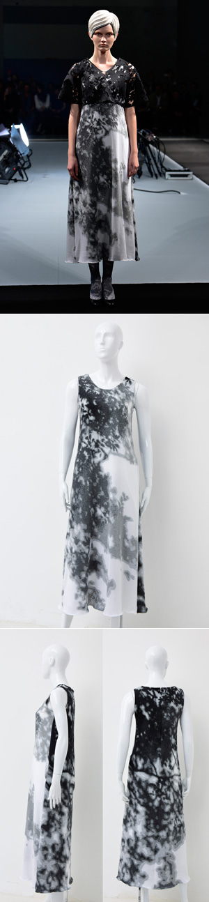 そして後半には、2013-14 A/W 「COLOR」からの流れを汲む、他分野の技術を取り入れた服が登場。