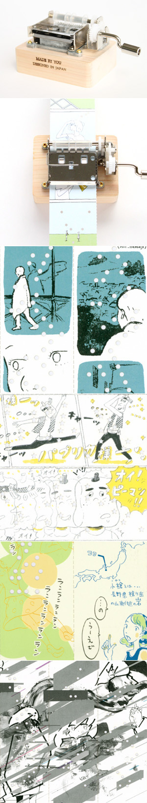 実は、帯状の漫画をオルゴールに通して、漫画と音を同時に楽しむことができるのです。選ばれた漫画家も個性あふれる顔ぶれ。