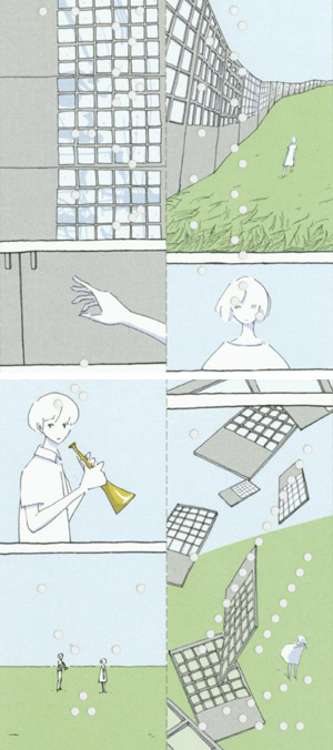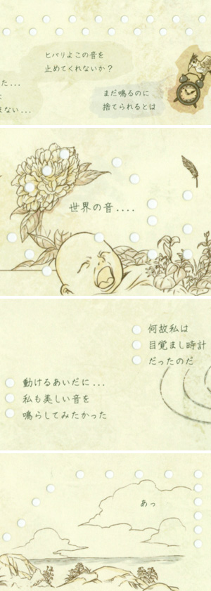 目覚まし時計の音や、鳥の鳴き声など、楽曲以外の音をオルゴールで表現したパートと、音楽的な表現、そして音のない部分が巧みに構成され、ストーリーと一体になっている作品。漫画を様々なメディアへと積極的に展開する萱島さんならではの表現。