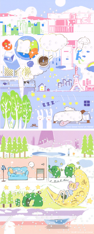 家で過ごす日常の楽しさを「Home! Sweet Home!」という曲に乗せて表現した作品と、夢見る幸せなひと時をやさしい曲に乗せて表現した作品。どちらもイラストのようなカラフルでポップな表現で、小さな子どもにも楽しめそう。