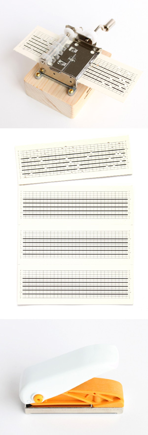 こちらが「OTOWA 紙オルゴールキット」。オルゴール本体に加えて、穴をあけるための小さなパンチと、五線譜はがきが5枚が入っている。五線譜はがきは、切り離すと1枚から4本の帯ができ、好きな長さにつなげて使う。
