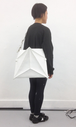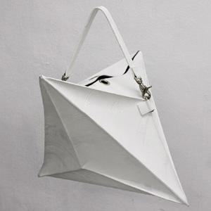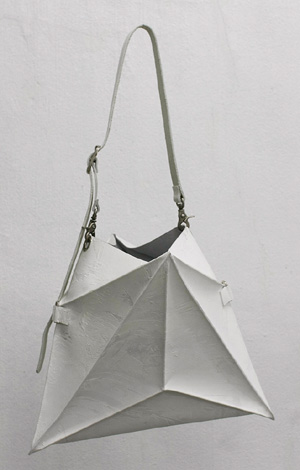 w15-03-wh 立方体を壊す、というテーマで幾何学的な変形を考察し、導かれた新しいカバンの立体。