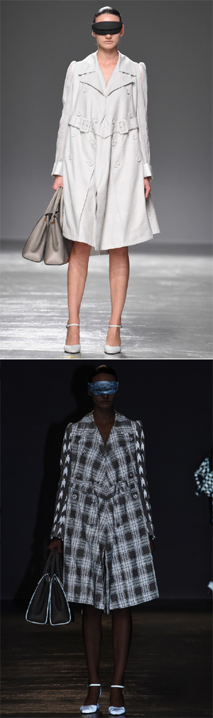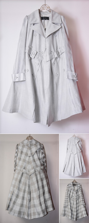 テーマは「REFLECT」。素材が光を反射するだけでなく、服の形も本来は体の中心で反転すべきところが、ずれた位置で反転しています。(REFLECT TRENCH COAT)