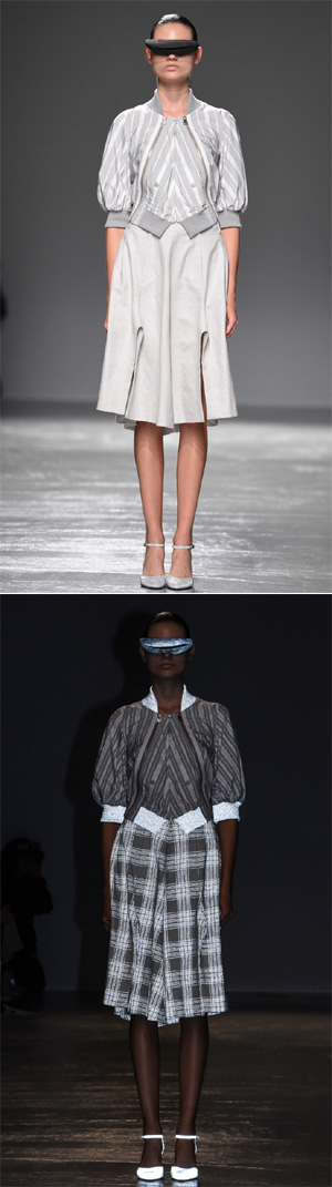 その後も次々に現れる服は、どれも黒や白、ストライプなど、シンプルな色や柄を見せながらも、突然明滅を始め、全体が光ったり、あるいは光が細かいチェック柄を浮かび上がらせたりと、瞬時に変化するのです。