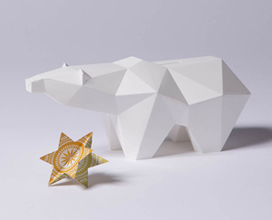 子供服などを作っているフランスのブランド「coq en pate(コックアンパット)」のために作ったクマの貯金箱。ペーパークラフトではなく、プラスチックでできているそうです。